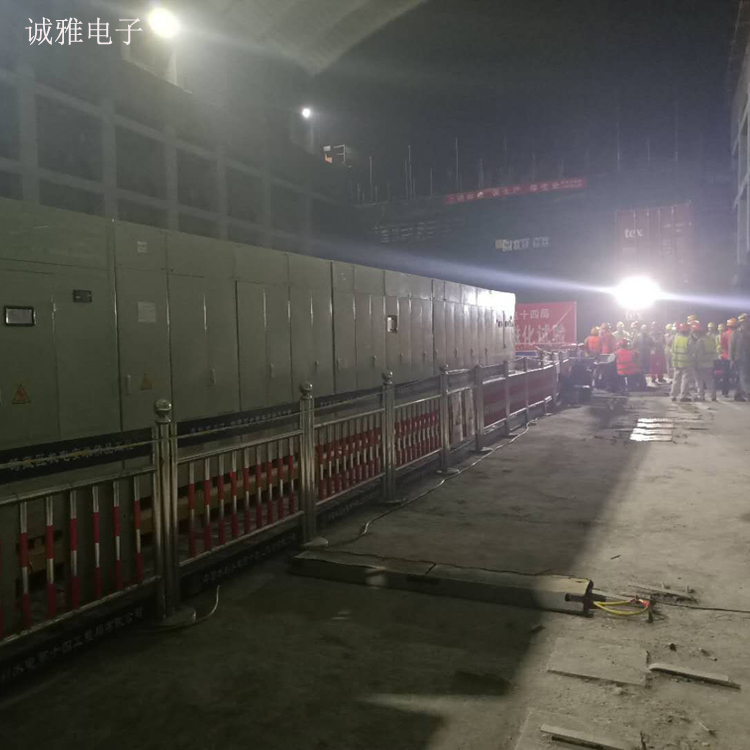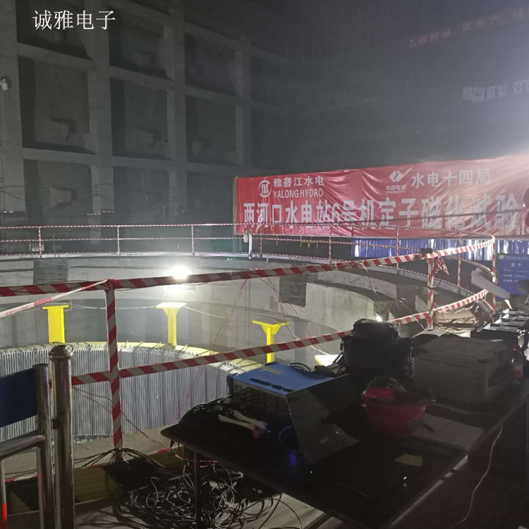 兩河口定子磁化試驗測試現場          對于大型水輪發電機組,定子鐵心是由硅鋼片現場疊裝而成.一般通過鐵心磁化試驗對其安裝水平與產品質量進行檢驗.因此,鐵心磁化試驗數據的準確性有很高的要求。大型水輪發電機的定子鐵心磁化試驗的數據非常重要。勵磁電壓的選擇、測量線圈的布置、疊壓系數的確定等因素對定子鐵心磁化試驗準確性的影響。對同類型機組鐵芯磁化試驗的準備與現場試驗提出建議,使試驗結果更加真實,可靠,有效反映鐵芯安裝水平與產品質量,提高機組運行可靠性。 目前國內此類定子測試大都采用工頻電源對定子進行測試,但由于定子實際工作頻率較寬,工頻測試不能滿足現場要求。此類大功率測試變頻電源技術多被國外壟斷,我們通過詳細了解現場工況,通過采用多機并聯技術、從機自動跟蹤技術及并聯動態均流技術,突破技術瓶頸,解決技術難題,成功設計出一款符合水電機組定子測試應用工況的高壓變頻電源。